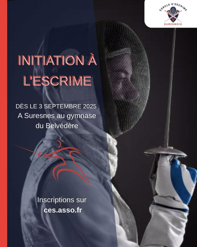 Le Cercle d'Escrime Suresnois organise le mercredi 3 et le vendredi 5 septembre 2025 des séances d'initiation à l'escrime, à la salle d'armes du Gymnase du Belvédère.